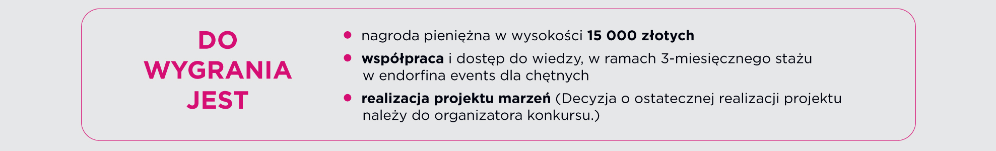 PRACA Z ZESPOŁEM ENDORFINA EVENTS 12 - 23 LISTOPADA 2025 Dzięki tej współpracy stworzysz finalną wersję Twojej wizji, rozbudowaną o pełny koncept, oprawę graficzną, wizualizacje oraz scenariusz wydarzenia. Twój pomysł nabierze kształtów! Wersja ta weźmie udział w wielkim finale, podczas którego poznamy laureata zwycięskiej koncepcji. |